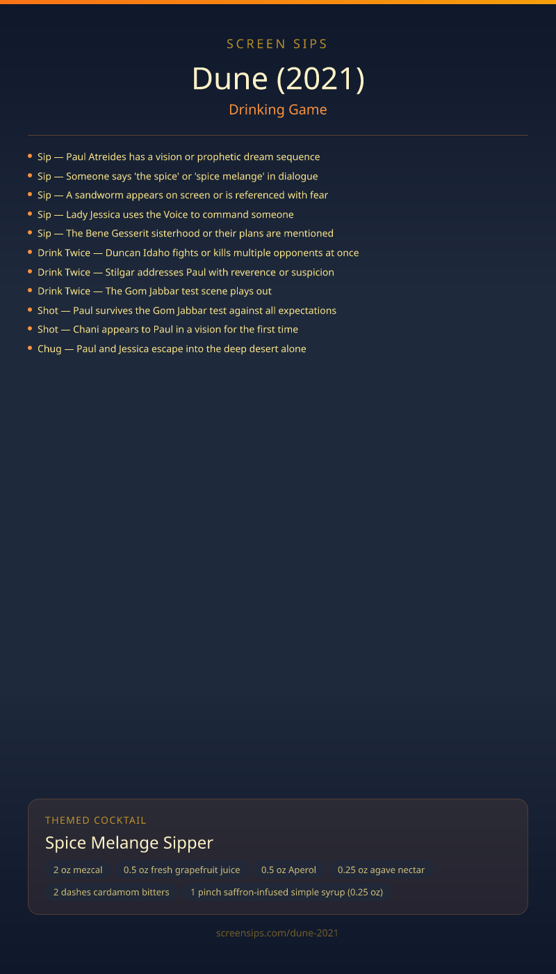 - Sip — Someone says 'the spice' or 'spice melange' in dialogue