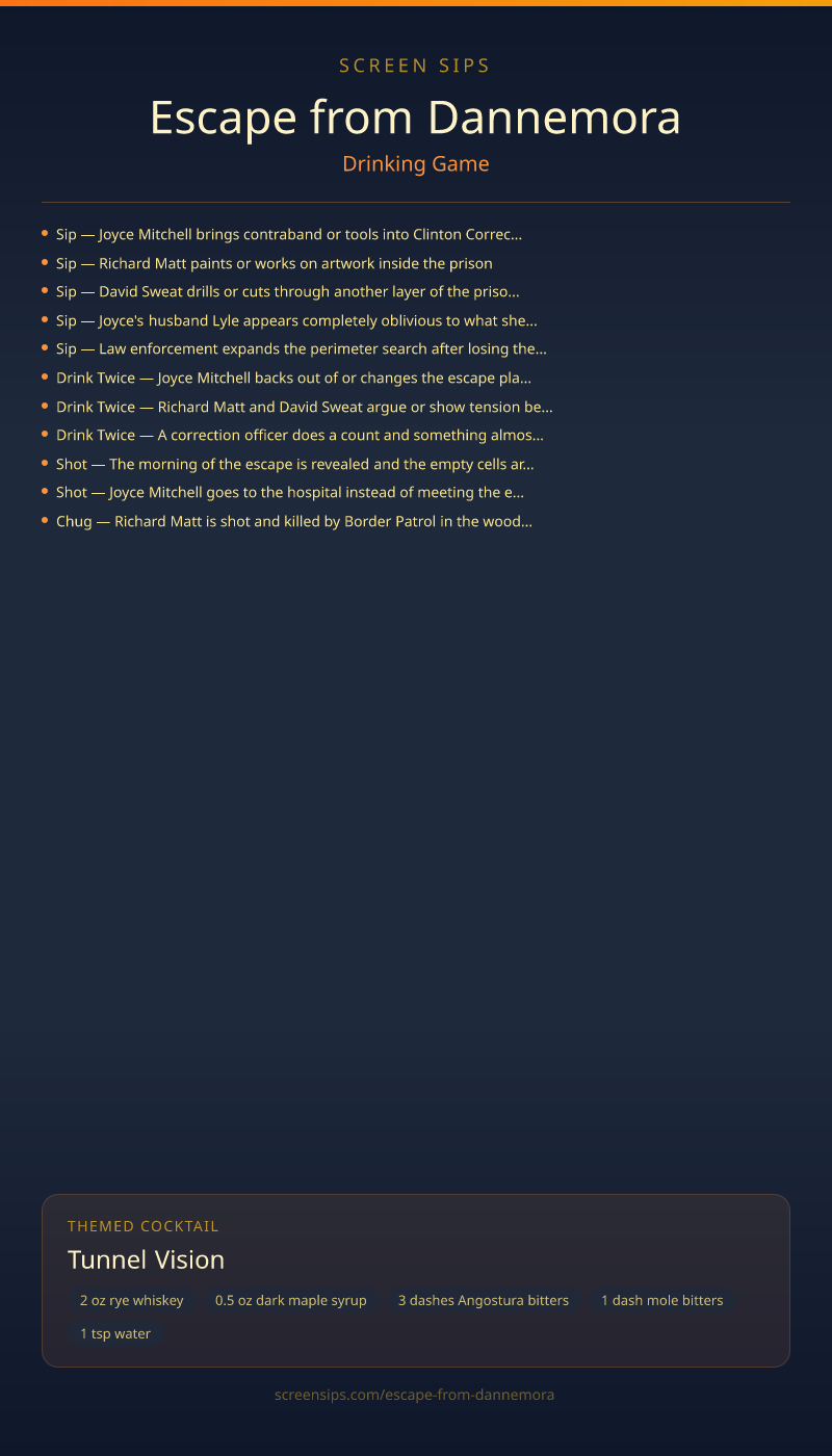 - Drink Twice — A correction officer does a count and something almost exposes the escape