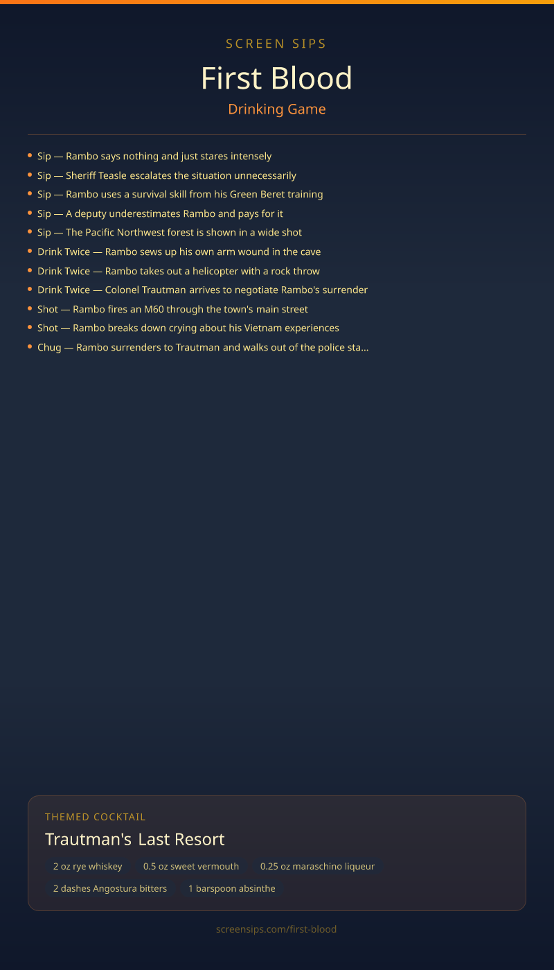 - Drink Twice — Colonel Trautman arrives to negotiate Rambo's surrender