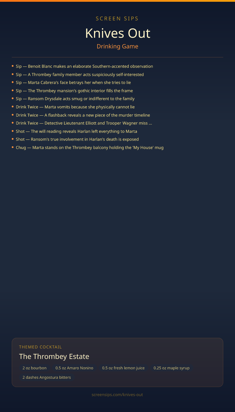 - Sip — A Thrombey family member acts suspiciously self-interested