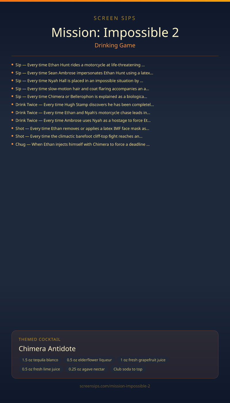 - Sip — Every time Ethan Hunt rides a motorcycle at life-threatening speed