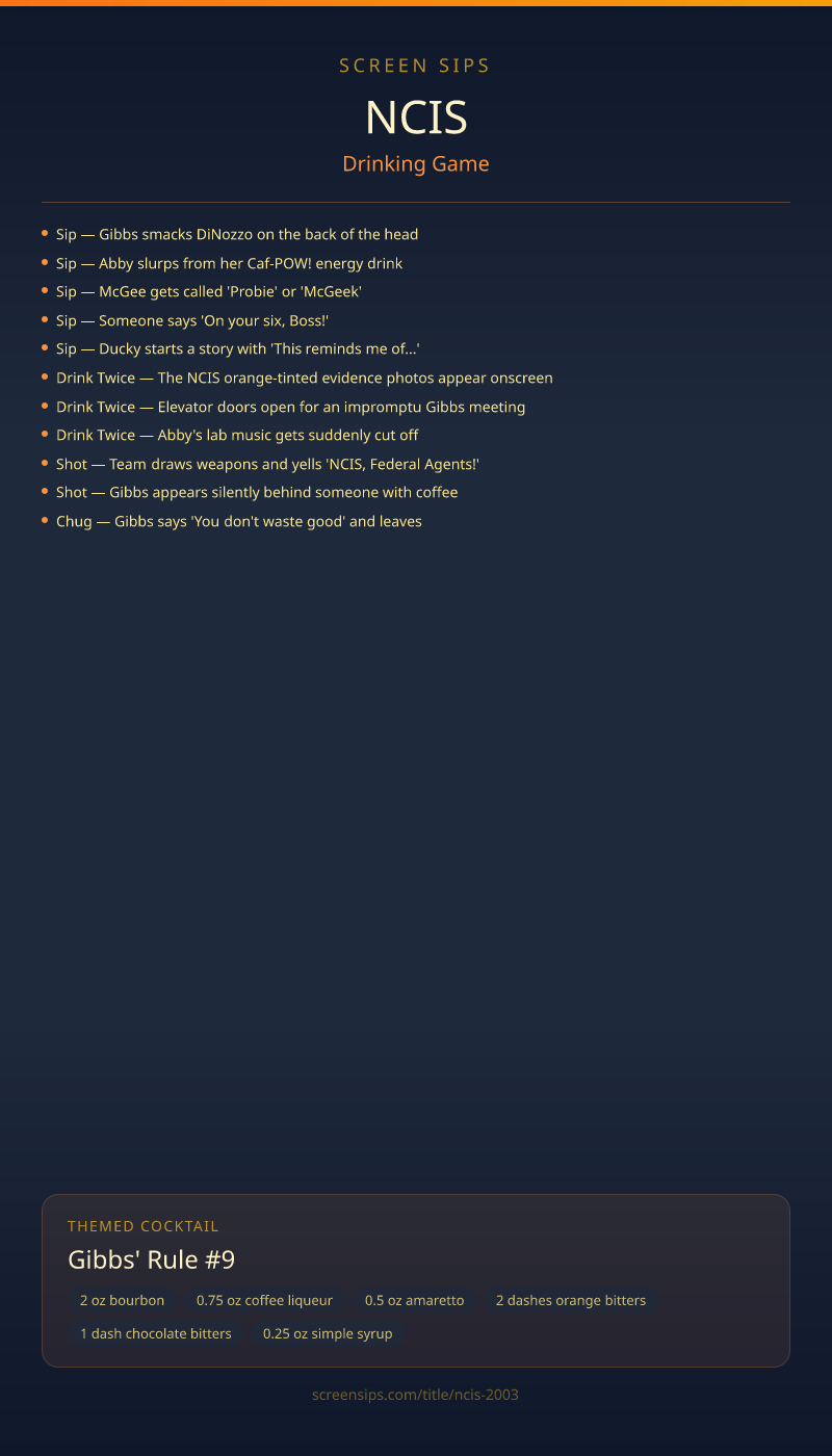 - Drink Twice — The NCIS orange-tinted evidence photos appear onscreen