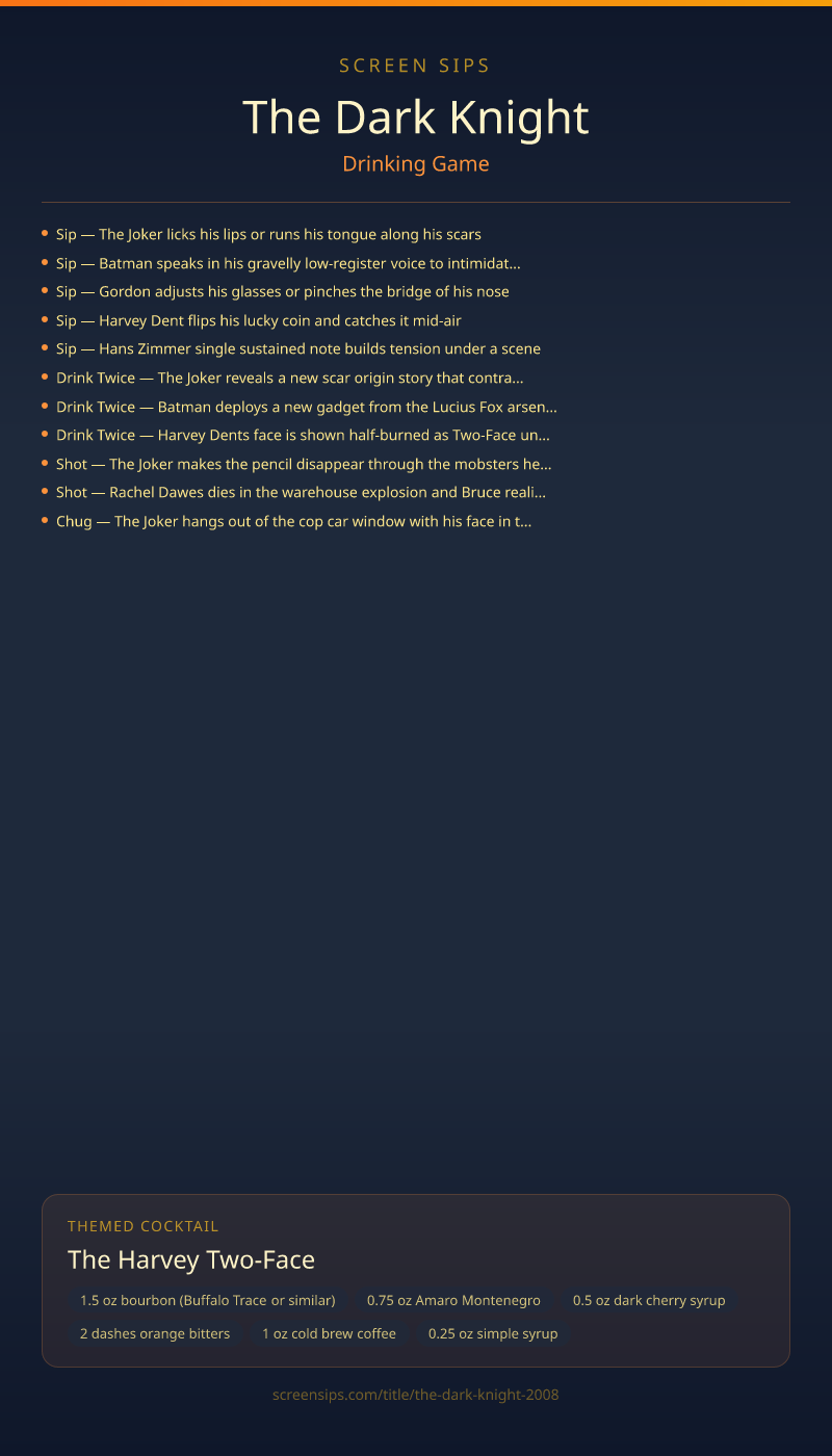 - Drink Twice — Harvey Dents face is shown half-burned as Two-Face under harsh lighting