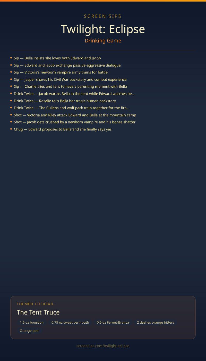 Edward vs. Jacob reaches peak awkwardness in a tent — drink through the love triangle.